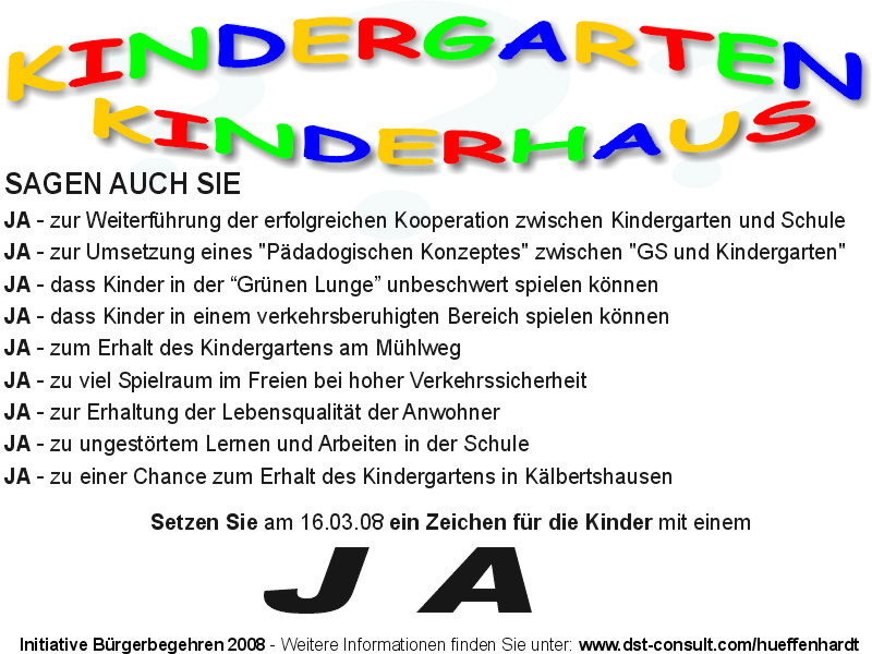 Hier erfahren Sie Wissenswertes über das "für und wieder" zum Thema Kinderhaus in Hüffenhardt welches auf dem Gelände der Grundschule errichtet werden sollte, während im bestehenden Kindergarten (Mühlweg) bereits seit > 2 Jahren erfolgreich die Kleinkinderbetreuung durchgeführt. Ein Vorteil - ausser die Nähe zwischen Grundschule und Kinderhaus - war aus den Gemeindeargumenten nicht erkennbar. Aber informieren Sie sich einfach hier selbst über das gesamte Thema.