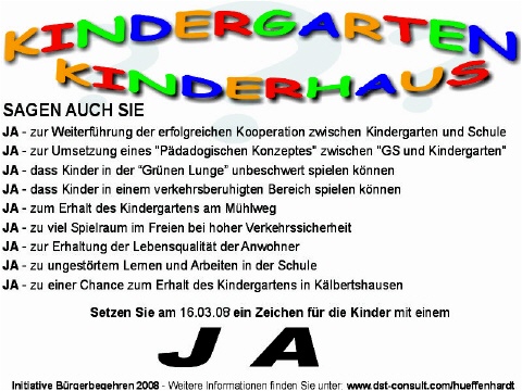 Um die Lage unseres Kindergartens, welcher mitten in einer Grünen Lunge liegt, wird Hüffenhardt von vielen Gemeinden beneidet. Dieser Kindergarten wurde damals vom Gemeinderat, vereinfacht gesagt, (durch den Beschluß vom 11.12.07 für einen Neubau) zur Bauruine erklärt.